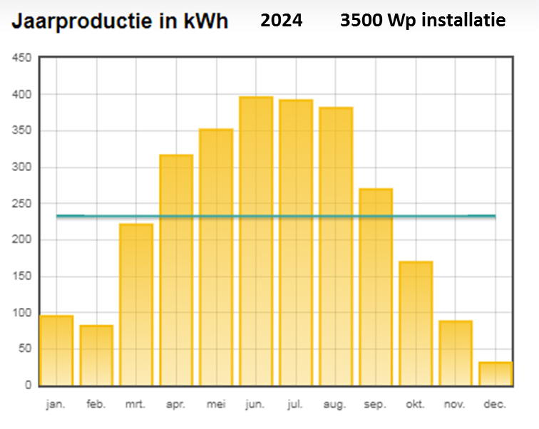 Hieronder is een weergave van de opbrengstverdeling in 2024 per maand van een goed functionerende zon PV installatie in het midden van het land met een geïnstalleerd vermogen van 3500 Wp. Deze installatie leverde in 2024 een opbrengst op van 2850 kilowattuur (kWh) tegen een opbrengst van 3042 kWh in 2023. Alleen de opbrengsten in de maand augustus waren conform de gemiddelde verwachtingen voor deze maand.