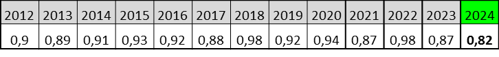 In onderstaande tabel zien we de jaarlijkse kWh/Wp opbrengst-factoren van het afgelopen decennium.
